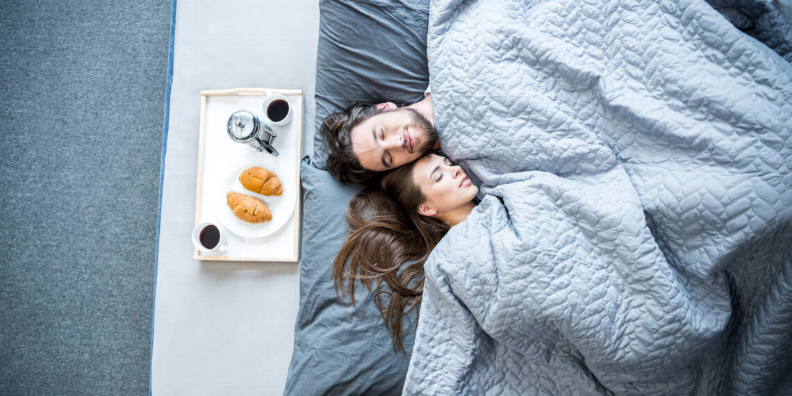 Top view of young man and woman sleeping in bed