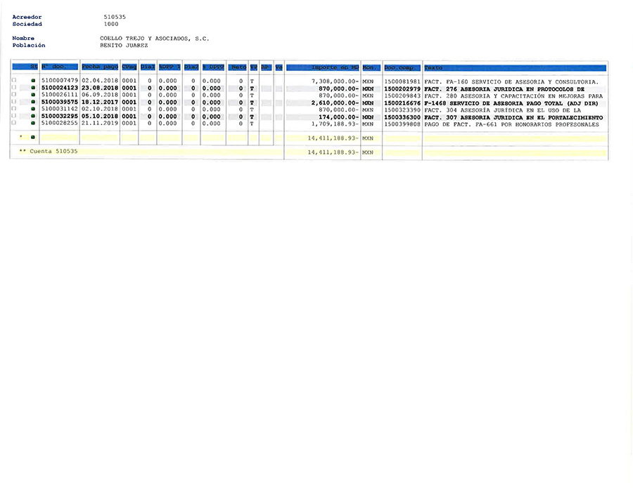 De acuerdo a dicha información, entre abril de 2018 y noviembre de 2019, el despacho “Coello Trejo y Asociados”, facturó al gobierno de Cabeza de Vaca honorarios por la cantidad de 14.4 millones de pesos.