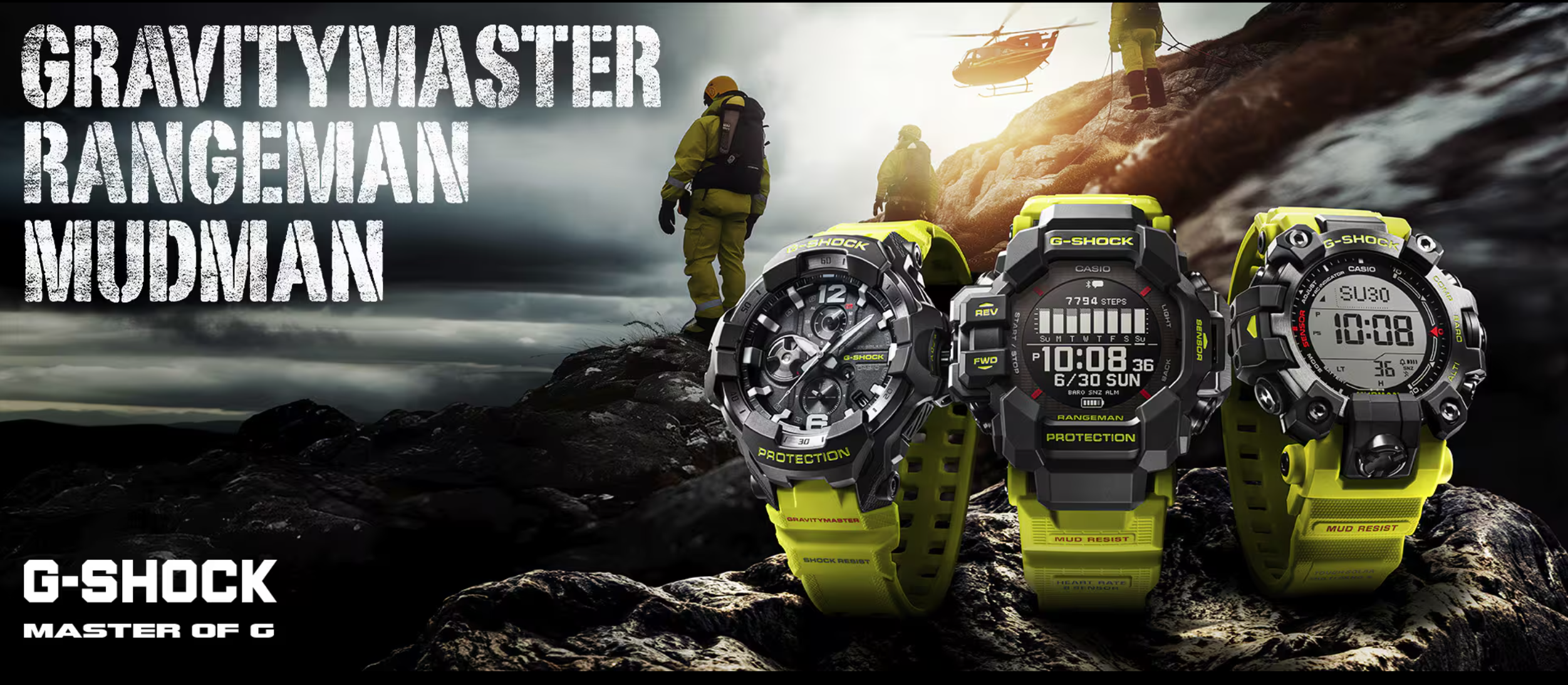 Finalmente, la línea MASTER OF G se enriquece con el lanzamiento de la colección “Rescue in Yellow”, tres modelos de relojes que rinden homenaje a los profesionales que participan en misiones de rescate. El trío de relojes de esta colección está compuesto por los emblemáticos modelos GRAVITYMASTER (GR-B300RY), MUDMAN (GW-9500MRY) y RANGEMAN (GPR-H1000RY). Esta impactante línea incorpora un tono amarillo brillante como elemento predominante, un color que transmite conciencia de peligro, y que también simboliza la valentía y la energía de quienes enfrentan condiciones extremas y peligrosas día a día.