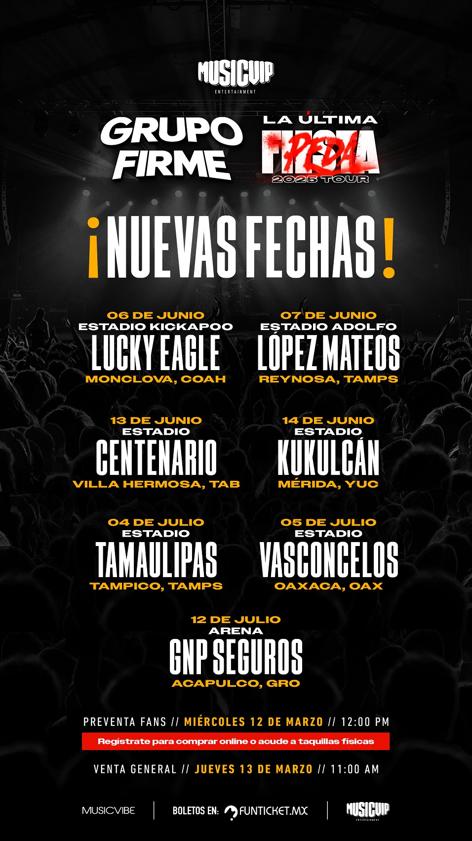 Grupo Firme ha añadido las siguientes fechas a su gira, llevando la fiesta a estadios y arenas emblemáticas de México: