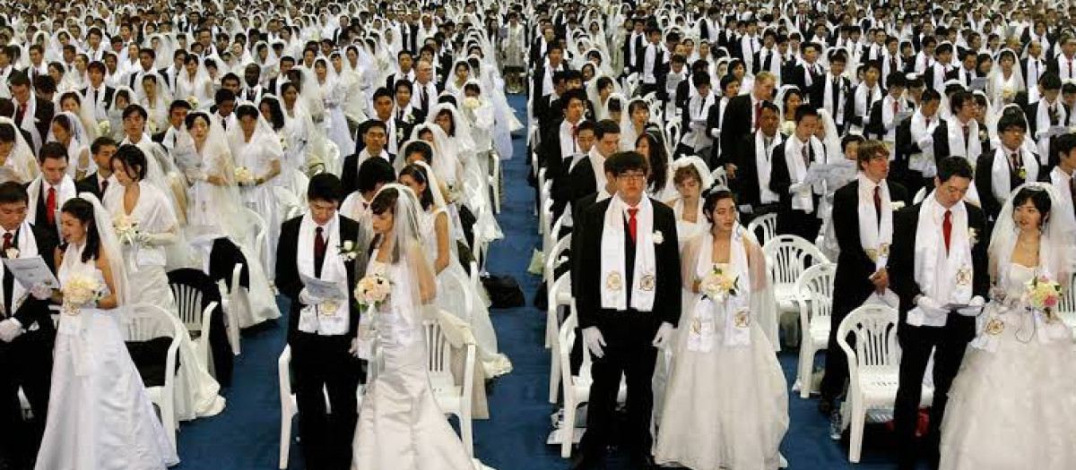 Vista aérea de una ceremonia de la Iglesia de la Unificación con cientos de asistentes uniformados en túnicas blancas y amarillas, desfilando en formación alrededor de un féretro en un evento multitudinario que refleja la estructura y rituales característicos de la secta Moon.