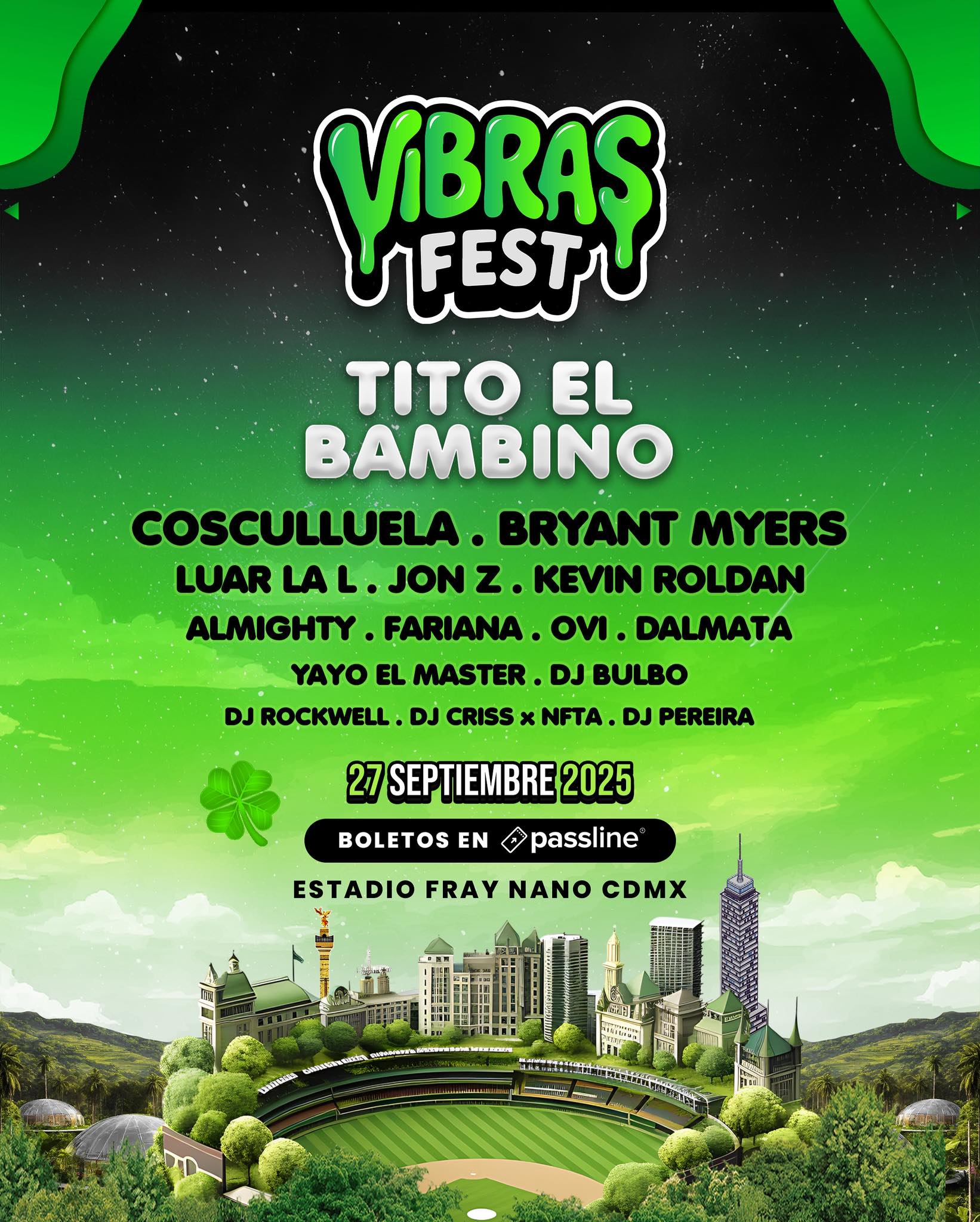 Vibras Fest 2025 está dispuesto para una jornada de música urbana con un enfoque en la “vibra” callejera, utilizando el Estadio Fray Nano como escenario principal para este concepto. Los boletos disponibles en Passline México detallan: